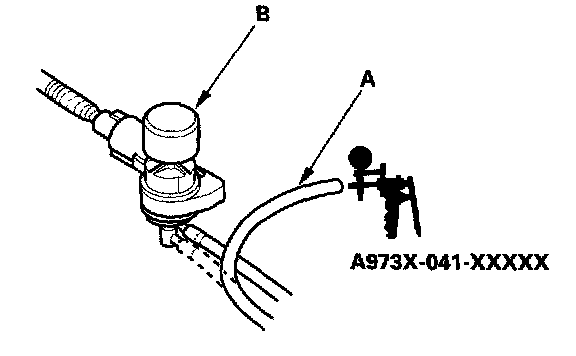 12. Disconnect the lower vacuum hose (A) from the engine mount control solenoid valve (B) and connect a vacuum pump/gauge to the hose.