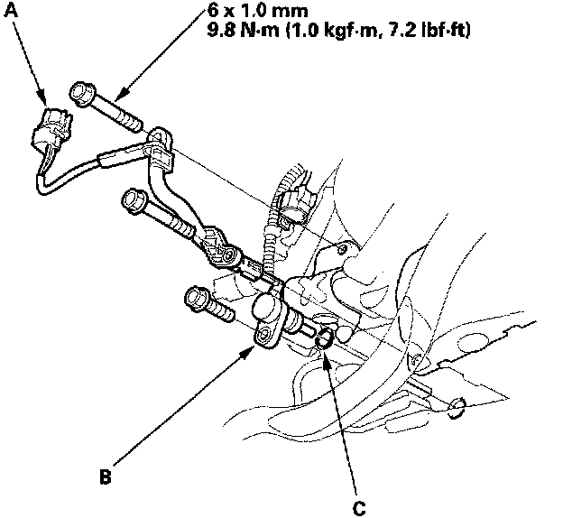 2. Remove the bolts securing the sensor harness clamp and ATF temperature sensor, then remove the ATF temperature sensor (B).