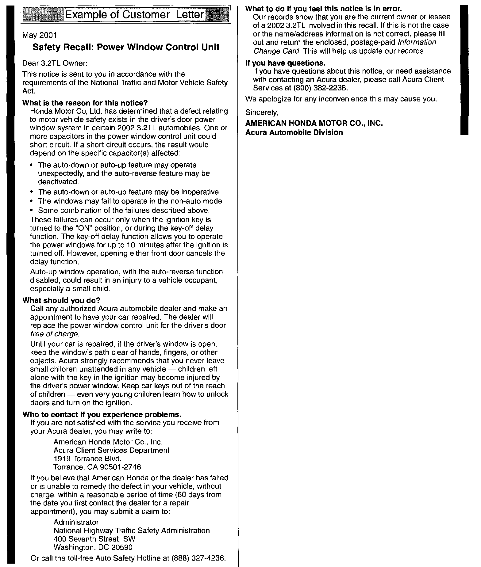Safety Recall: Driver's Window Control Unit