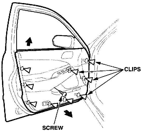 3. Remove the door panel mounting screw on the underside of the armrest. Use the trim pad removal tools to release the clips around the edge of the door panel. Pull the door panel upward to remove it.