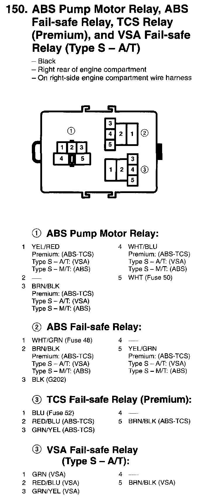 ABS Pump Motor Relay, ABS Failsafe Relay, TCS Relay (Premium), And VSA Failsafe Relay (Type S - A/T):