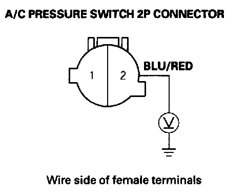 A/C Pressure Switch Circuit Troubleshooting (Except Type S Model)1. Disconnect the A/C pressure switch 2P connector.
