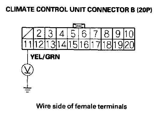 9. Measure the voltage between the No. 11 terminal of climate control unit connector B (20P) and body ground.