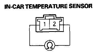 Compare the resistance reading between the No. 1 and No. 2 terminals of the in-car temperature sensor with the specifications shown in the graph; the resistance should be within the specifications.