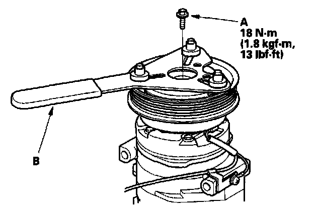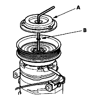 1. Remove the center bolt (A) while holding the pressure plate with a commercially available A/C clutch holder (B).