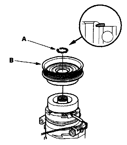 3. If you are replacing the field coil, remove the snap ring (A) with snap ring pliers, then remove the pulley (B). Be careful not to damage the pulley or the compressor.