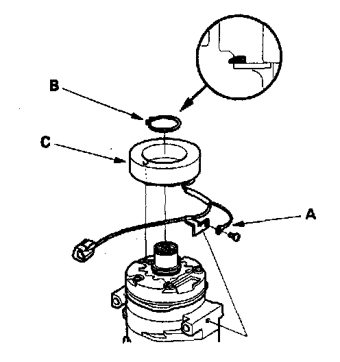 4. Remove the screw from the field coil ground terminal (A). Remove the snap ring (B) with snap ring pliers, then remove the field coil (C). Be careful not to damage the field coil or the compressor.
