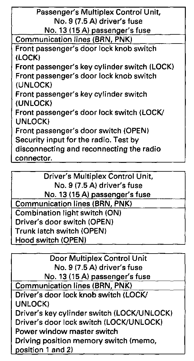 1. Check the No.9 (7.5 A) fuse in the driver's under-dash fuse/relay box, and the No.13 (7.5 A) fuse in the passenger's under-dash fuse/relay box.