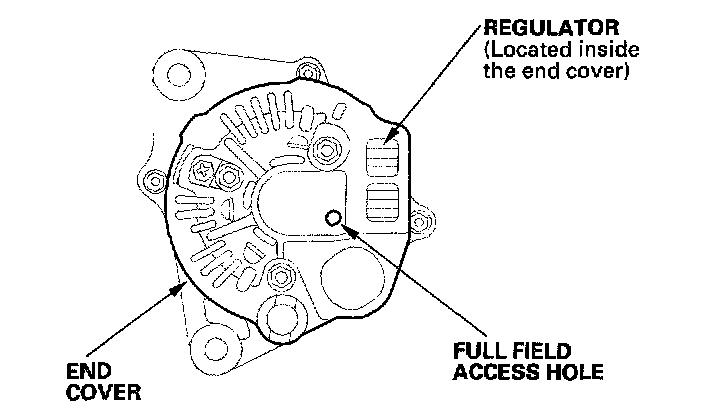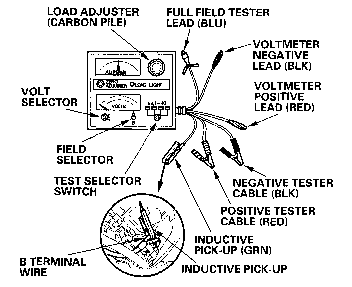 11. With the engine speed still at 2,000 rpm, full-field the alternator. Attach the probe to the VAT-40 full-field test lead, and insert the probe into the full field access hole at the back of the alternator. Switch the field selector to the "A (Ground)" position momentarily, and check the amperage reading. Because voltage will rise quickly when the alternator is full-fielded, do not allow the voltage to exceed 18 V: it may damage the electrical system.