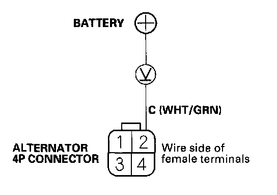 4. Measure voltage between the alternator 4P connector terminal No.2 and the positive terminal of the battery.
