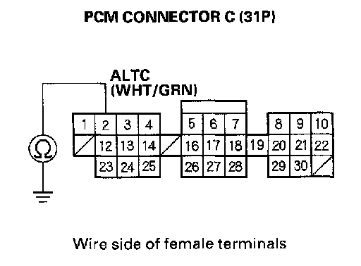 7. Check for continuity between the PCM connector terminal C2 and body ground.