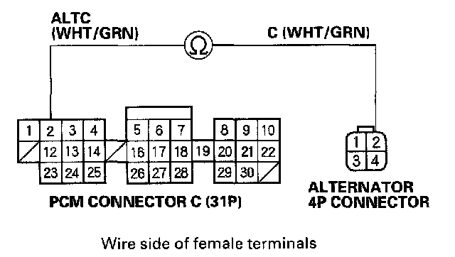 10. Check for continuity between the PCM connector terminal C2 and alternator 4P connector terminal No.2.