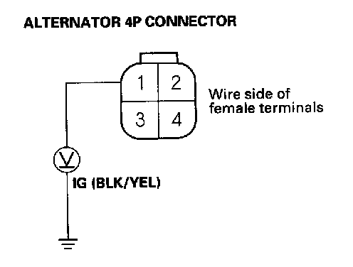 10. Measure the voltage at the No.1 terminal of the alternator 4P connector with the ignition switch ON (II).