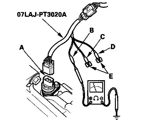 3. Connect the RED test harness clip (B) to the positive prove of an ohmmeter. Cover the white (C) and green (D) test harness with protective tape (E).