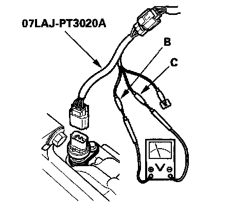 5. Connect the WHT test harness clip (B) to the positive probe of a voltmeter, and connect the RED test harness clip (C) to the negative probe.
