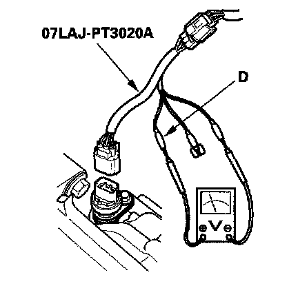 8. Connect the GRN test harness clip (D) to the positive probe of a voltmeter.