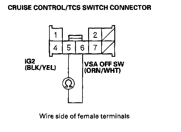 Check for continuity between terminal No. 5 and No. 6. There should be continuity when the VSA off switch is pushed.