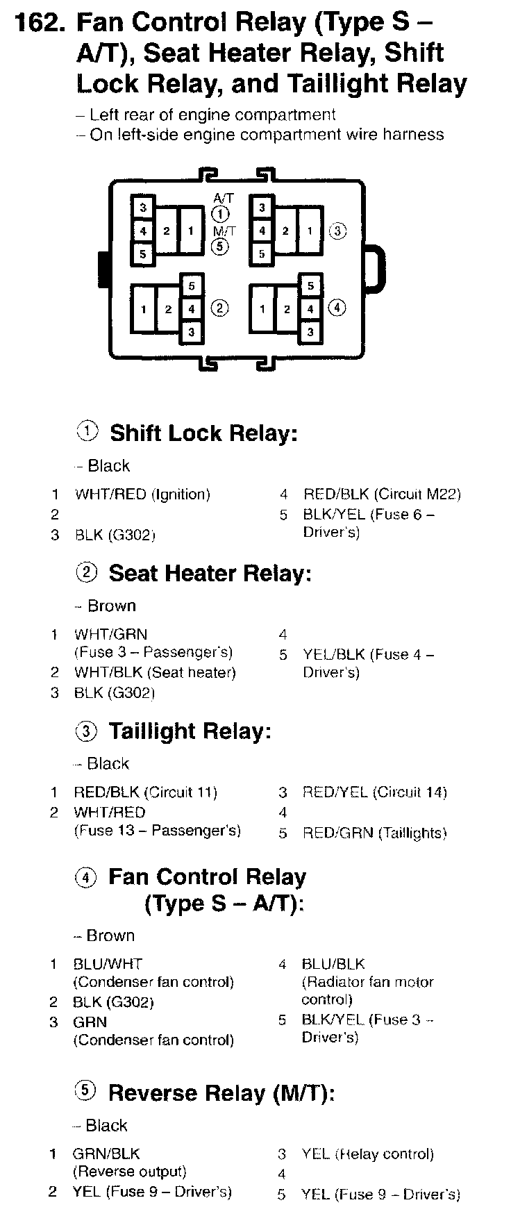 Fan Control Relay (Type S - A/T), Seat Heater Relay, Shift Lock Relay, And Taillight Relay: