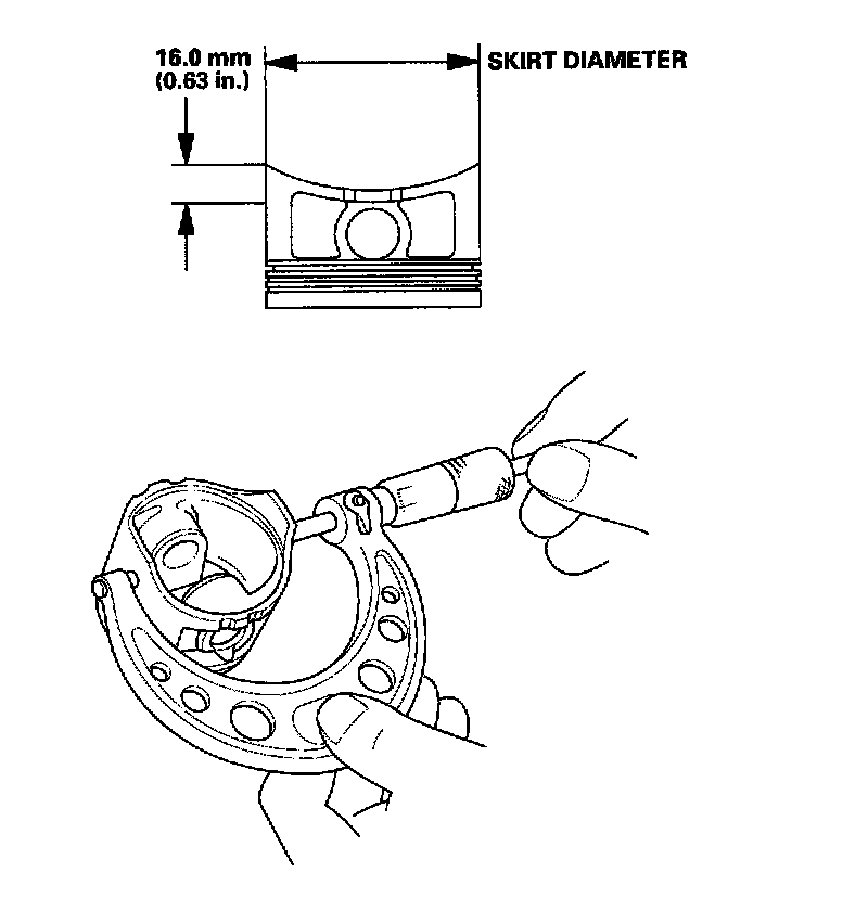 3. Measure the piston diameter at a point 16.0 mm (0.63 inch) from the bottom of the skirt.