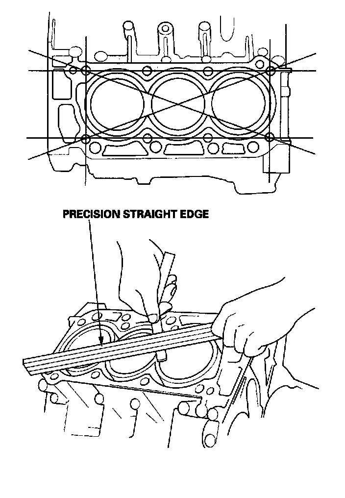 6. Check the top of the cylinder block for warpage. Measure along the edges and across the center as shown.