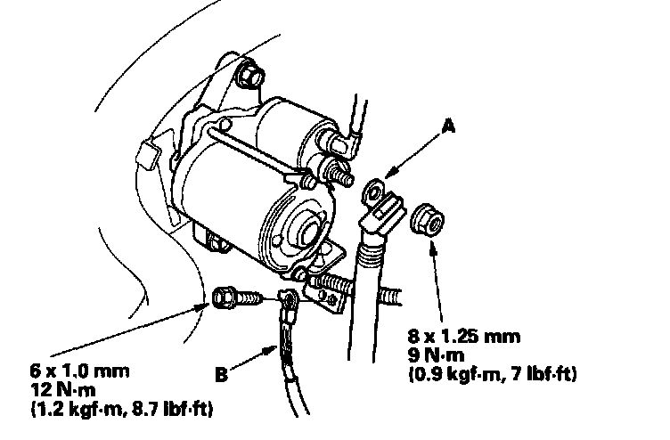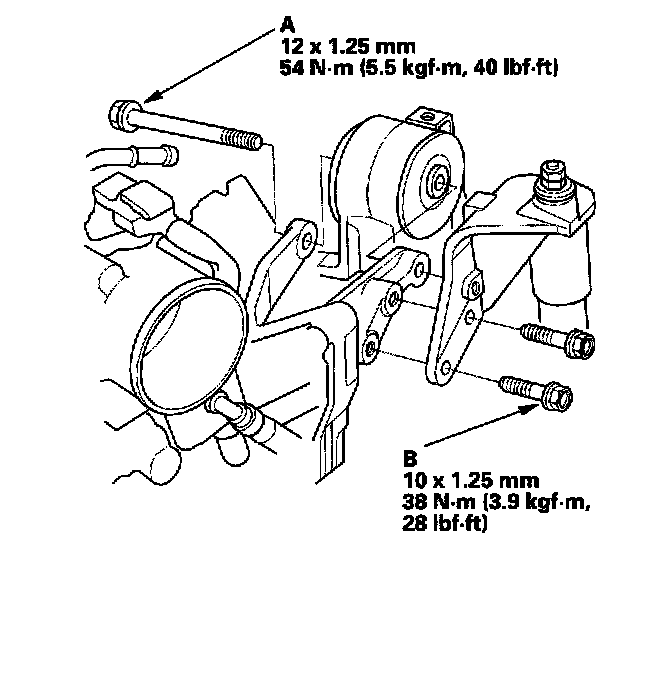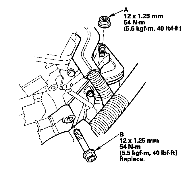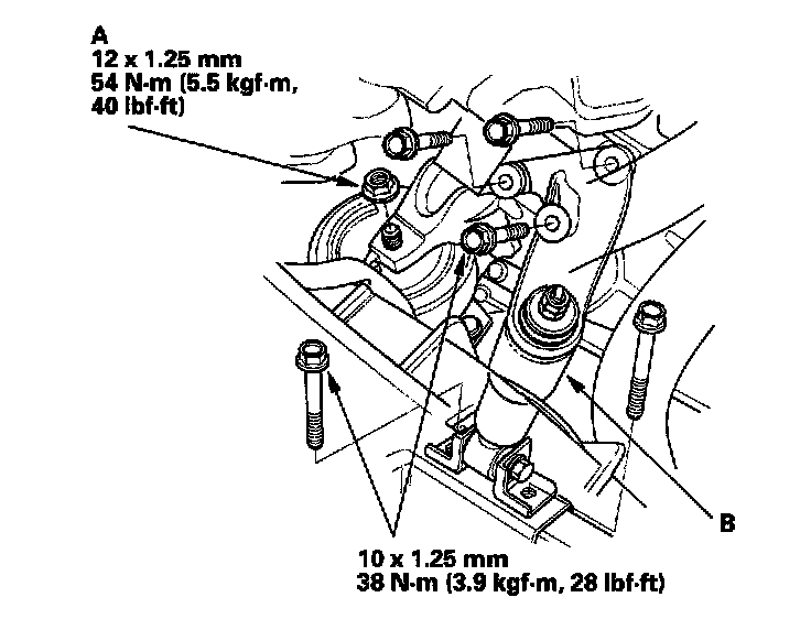 14. Tighten the rear mount bracket support nut (A) and mounting bolt (B) (A/T).