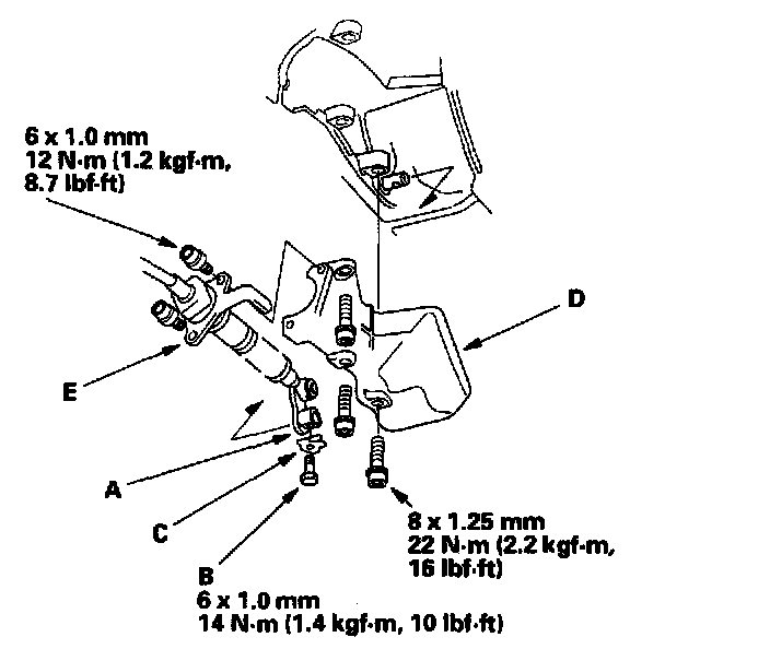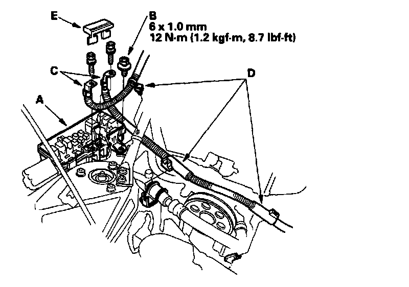 7. Connect the vacuum hose (D), and install the Power Steering (P/S) line (E) on its clamp.