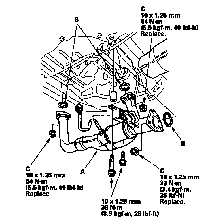 25. Install exhaust pipe A (A), using new gaskets (B) and new self-locking nuts(C).