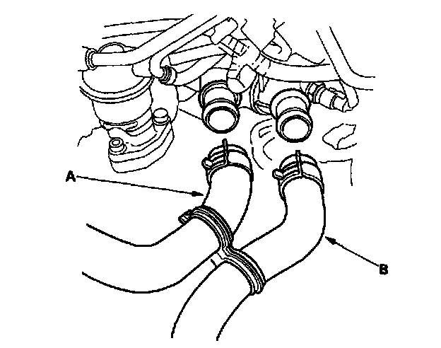 32. Install the upper radiator hose (A) and lower radiator hose (B).