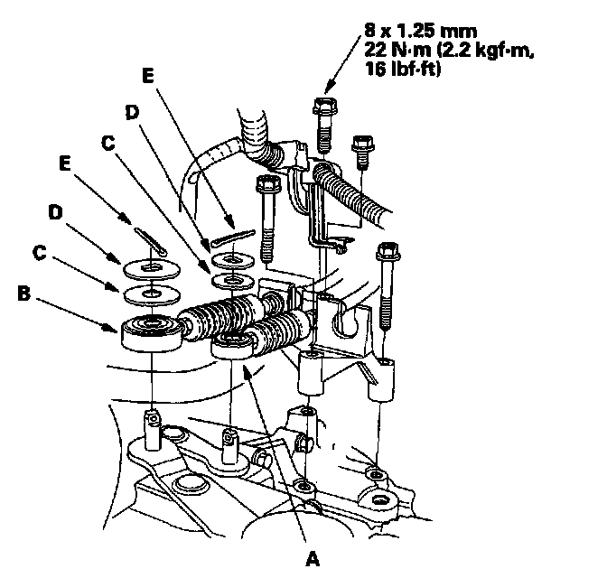 24. Install the shift cable cover (D), then install the shift cable holder (E) on the shift cable cover (A/T).