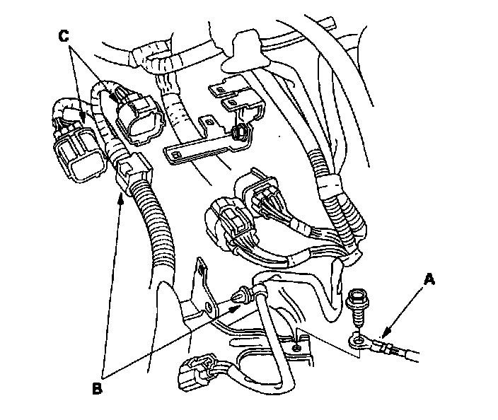 45. Install the ground cable (A) and harness clamps (B). Connect the engine wire harness connectors (C).