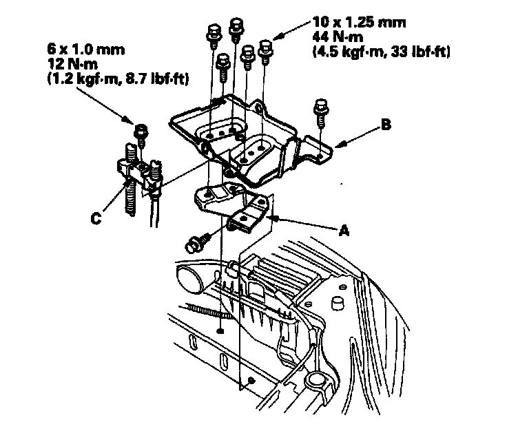 15. Tighten the rear mount support bolt (A) and rear engine damper mounting bolts (B) (M/T).