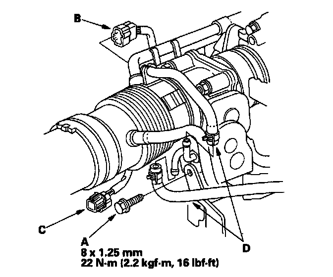 54. Tighten the bolt (A) securing the TCS control valve bracket. Connect the TCS control valve angle sensor connector (B), TCS control valve actuator connector (C) and water bypass hoses (D) on the TCS control valve assembly (J32A2 engine (A/T)).