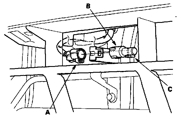 1. Disconnect the 2P connector (A) from the outside air temperature sensor (B). Lift the tab (C) to release the lock, and remove the outside air temperature sensor.