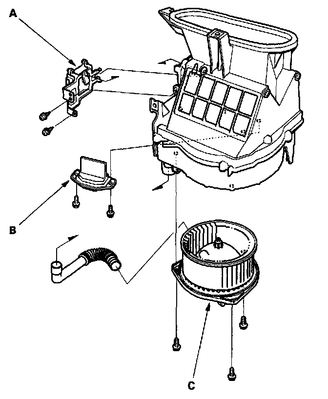 - The recirculation control motor (A), the power transistor (B) and the blower motor (C) can be replaced without removing the blower unit.