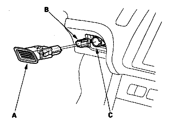 In-car Temperature Sensor Replacement1. Remove the in-car temperature sensor (A) from the dashboard, then disconnect the 2P connector (B) and the air hose (C). Be careful not to damage the sensor or the dashboard.