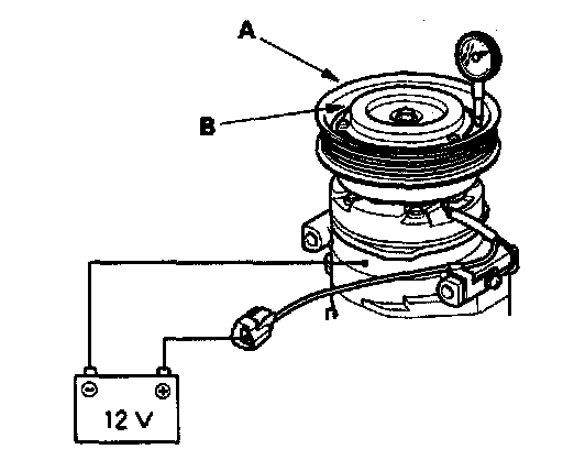 3. Measure the clearance between the pulley (A) and the pressure plate (B) with a dial indicator. Zero out the indicator, then apply battery voltage to the compressor clutch. Measure the movement of the pressure plate when the voltage is applied. If the clearance is not within the specified limits, the pressure plate must be reshimed.