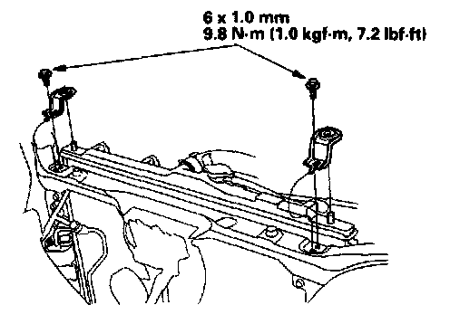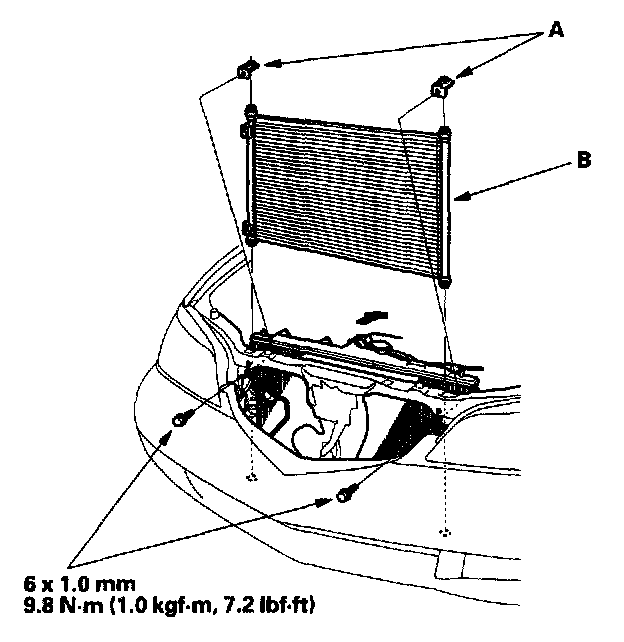 7. Remove the bolts and the condenser upper brackets (A), then remove the condenser (B) by lifting it up. Be careful not to damage the radiator or the condenser fins when removing the condenser.