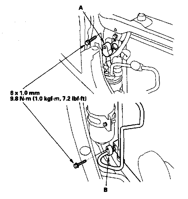 6. Remove the bolts, then disconnect the discharge line (A) and condenser line (B) from the condenser. Plug or cap the lines immediately after disconnecting them to avoid moisture and dust contamination.