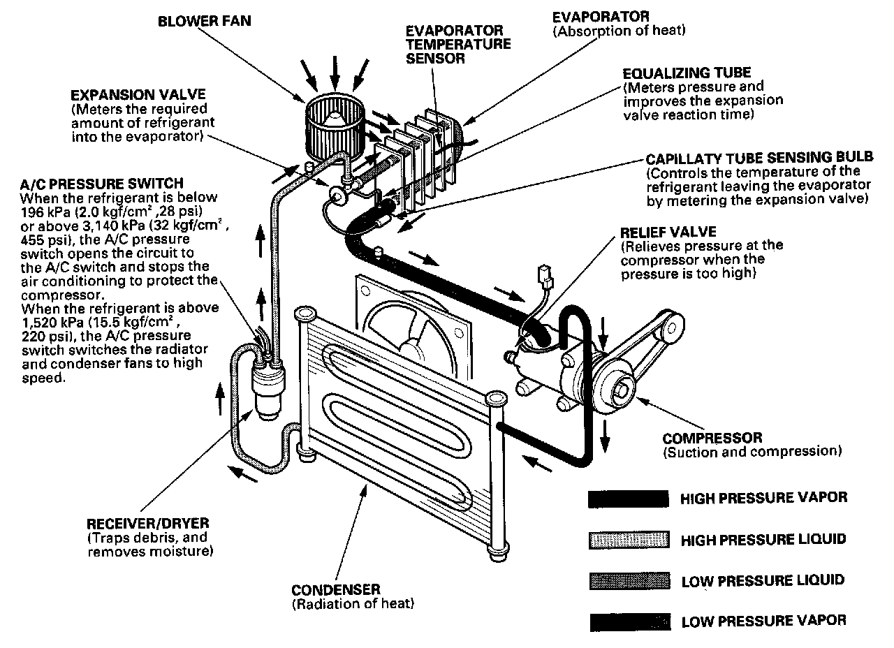 The air conditioning system removes heat from the passenger compartment by circulating refrigerant through the system as shown above.