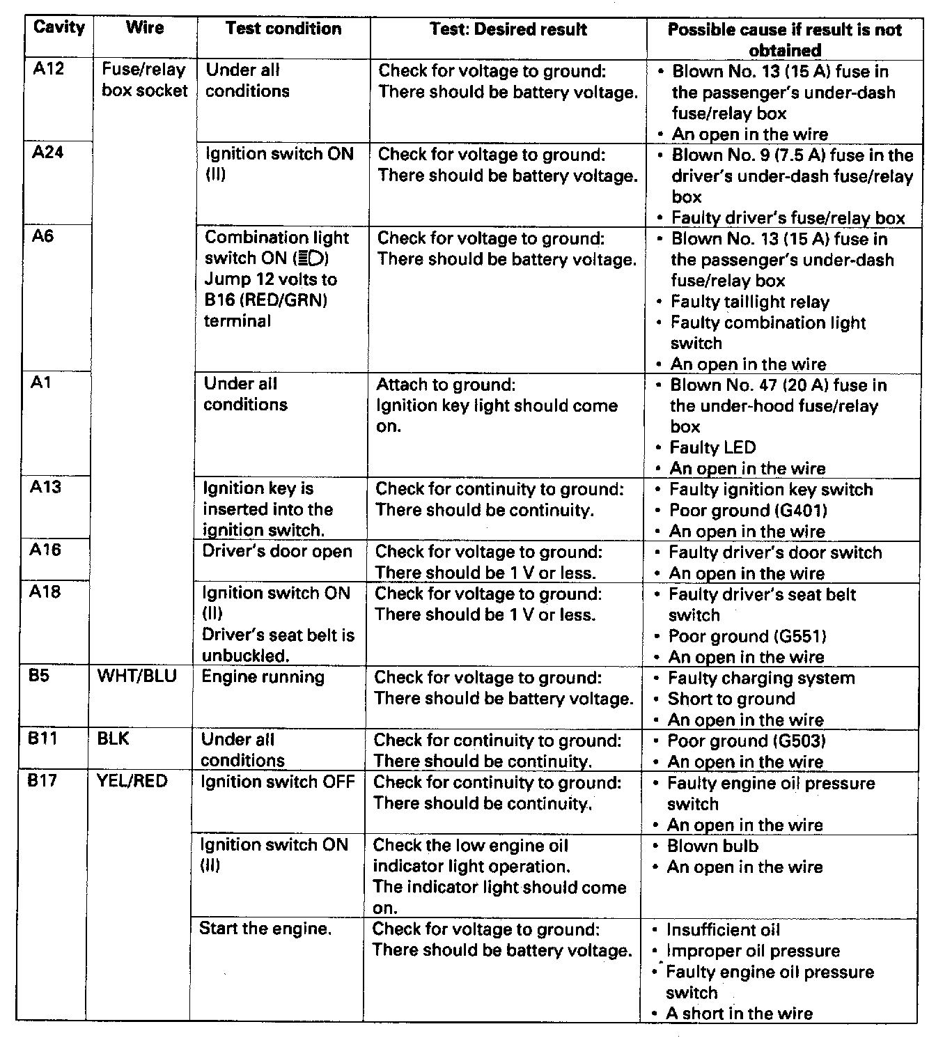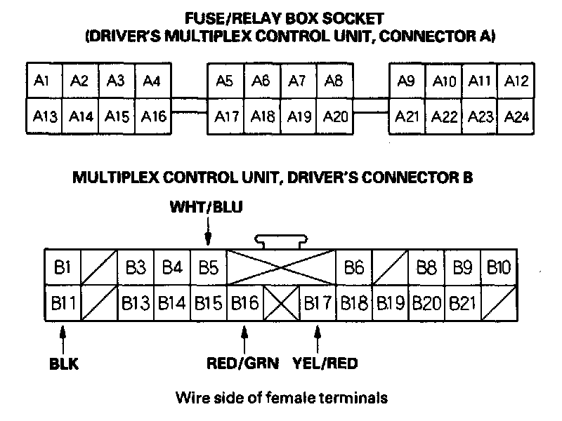 4. Make these input tests at the fuse/relay box socket and the multiplex connector B.