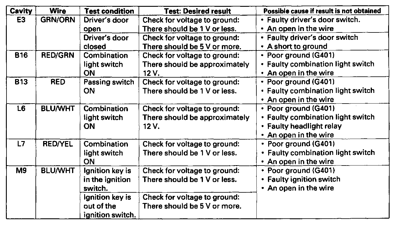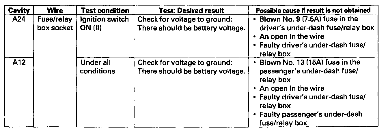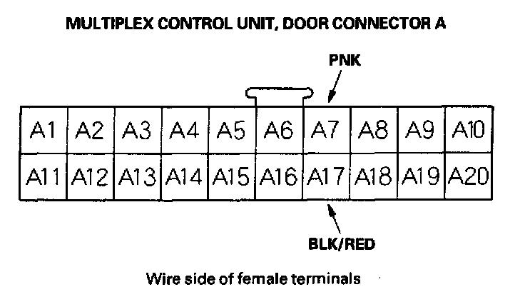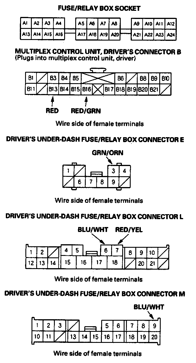 5. Reconnect the driver's multiplex control unit to the driver's under-dash fuse/relay box, and perform the following input tests at the appropriate connectors on the driver's under-dash fuse/relay box. For driver's under-dash fuse/relay box connector socket location.