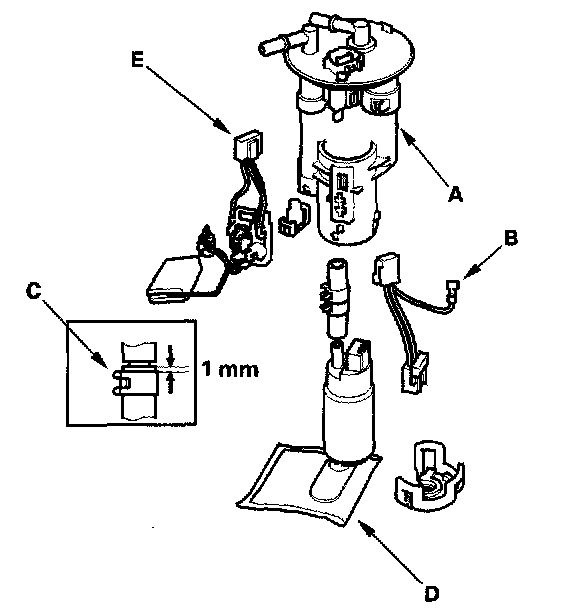 - When installing the fuel gauge sending unit (E), make sure the connection is secure and the connector is firmly locked into place. Be careful not to bend or twist it excessively.