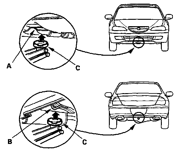 4. Position the floor jack under the front jacking bracket (A) or rear jacking bracket (B), center the jack lift platform (C) on the jacking bracket, and jack up the vehicle high enough to fit the safety stands under it.