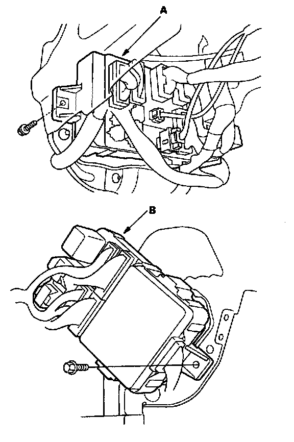 4. Remove the mounting bolt, and pull the driver's under-dash fuse/relay box (A) or passenger's under-dash fuse/relay box (B) away from the body.
