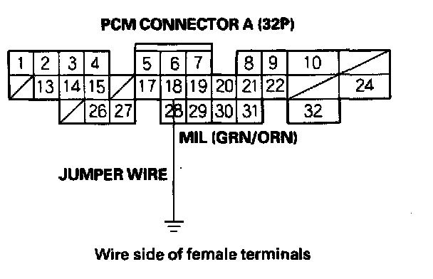 4. Turn the ignition switch OFF, and connect PCM connector terminal A18 and body ground with a jumper wire.