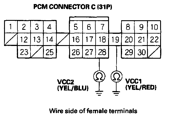 6. Turn the ignition switch OFF, then disconnect PCM connector C (31P) and check for continuity between body ground and PCM connector terminals C19 and C28 individually.