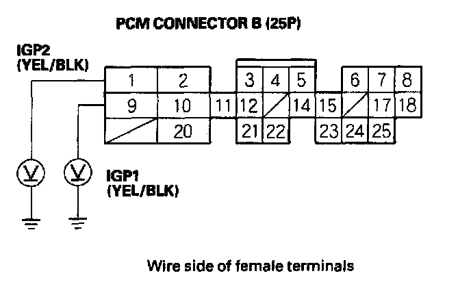 9. Turn the ignition switch ON (II), and measure voltage between body ground and PCM connector terminals B1 and B9 individually.