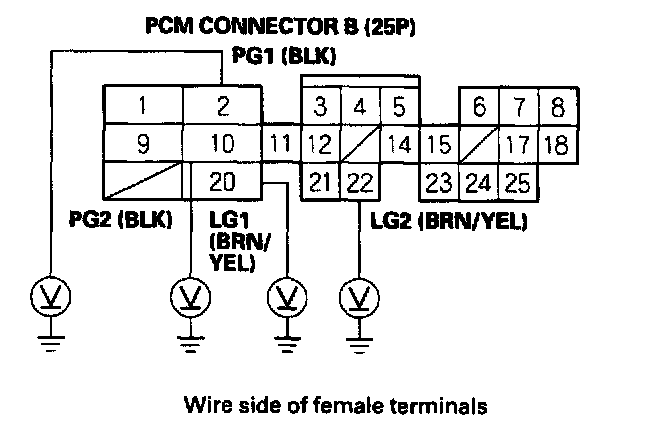 11. Turn the ignition switch ON (II), and measure voltage between body ground and PCM connector terminals B2, B10, B20, and B22 individually.