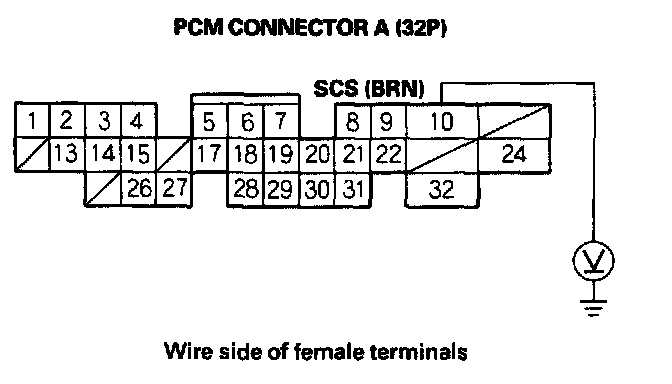 15. Turn the ignition switch OFF, then turn it back ON (II) and measure voltage between PCM connector terminal A10 and body ground.