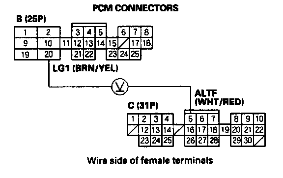 7. Measure voltage between PCM connector terminals B20 and C5.